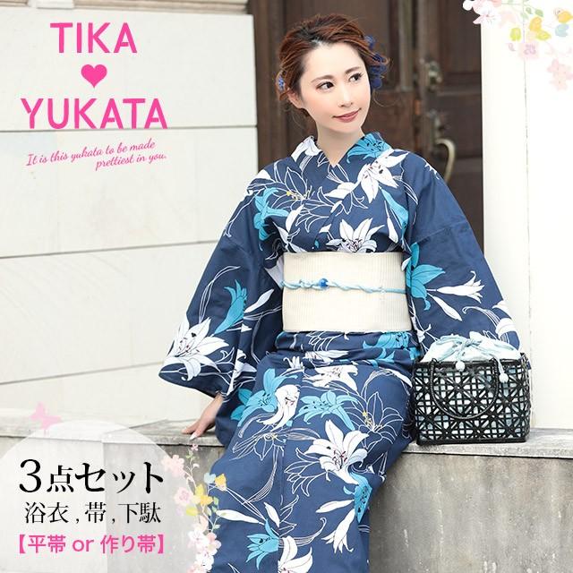 安い購入 浴衣 レディース 3点セット 浴衣 平帯or作り帯 下駄 紺地 百合 レトロ 青 白 大きいサイズ 売り切れ必至 Esiba Tg